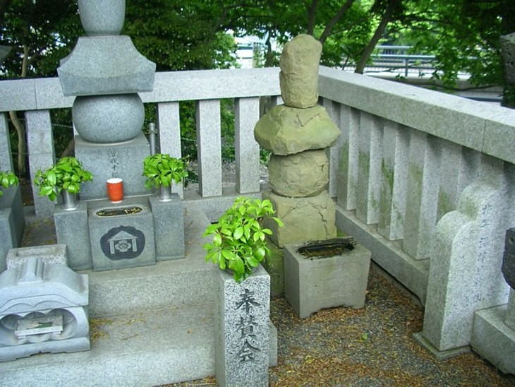 元々の墓石は風化した五輪塔らしい。右に兄の祐成、前の香台には伊東氏の庵木瓜紋。