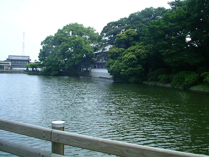 照明寺東の堀は最大巾40mに近い。南側の敷地の一部が広げられて籐棚が造られている。