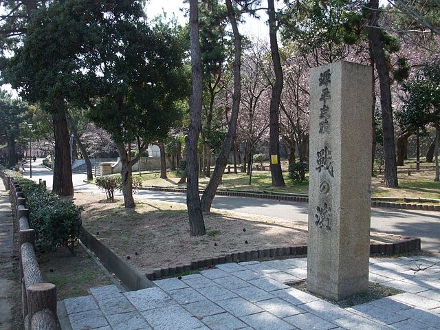 塩屋口を突破した源氏軍と平家軍が死闘を繰り広げた一ノ谷の浜辺、現在の須磨公園 戦(いくさ)の濱碑。