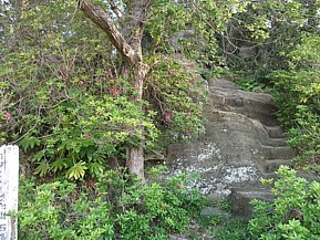 上: 泣き塔が建つ場所は外から見ると樹木の茂みに見えるが実際には大きな岩塊で、JRに改編前の国鉄時代は広い工場敷地だった。