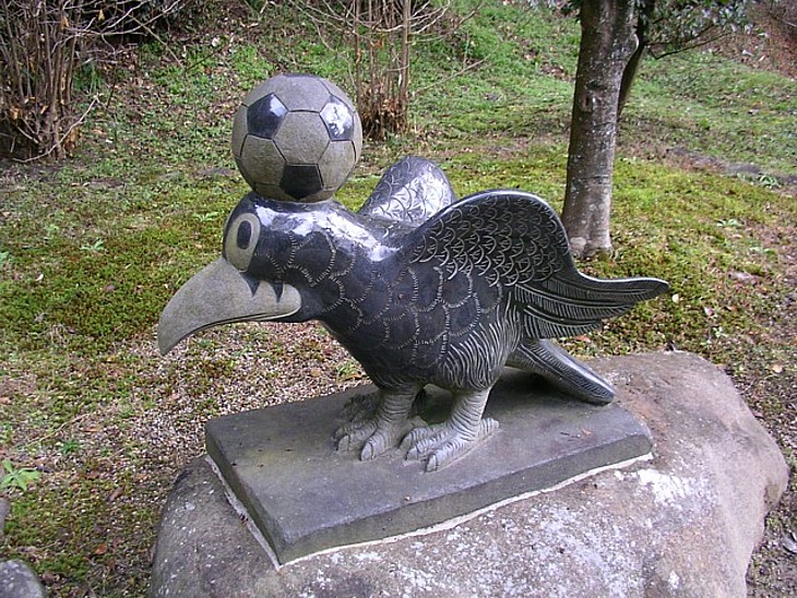 境内右手にはサッカー協会が寄進したヘディングする八咫烏像