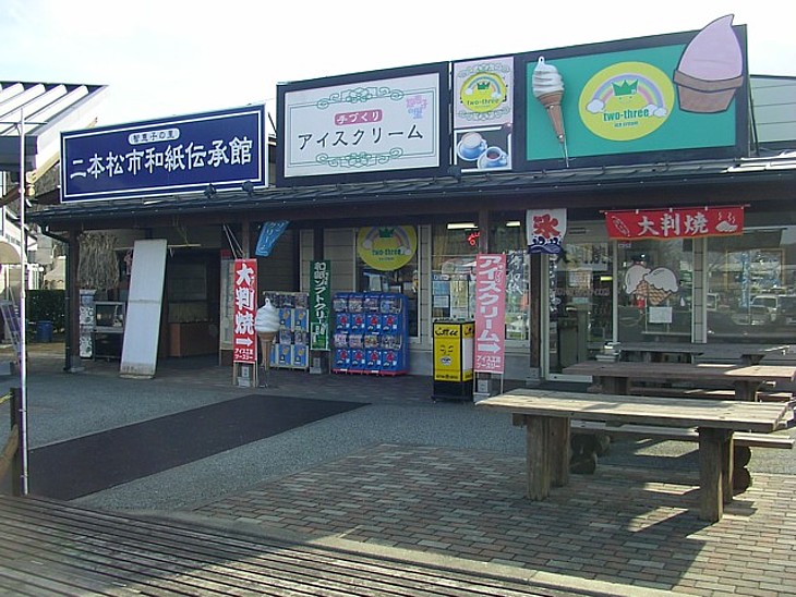 駐車場からの出口に近い駅舎の一角には「和紙伝承館」とアイスクリームなどを扱う別棟がある。