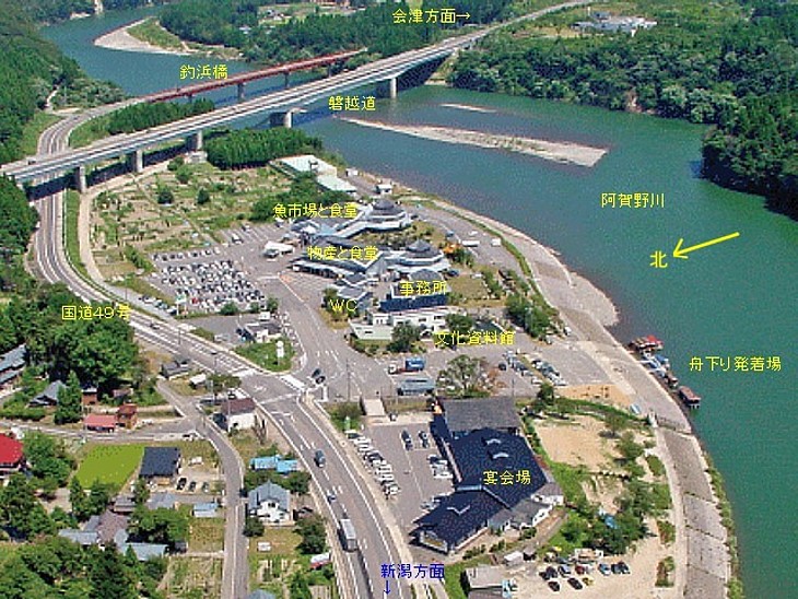 阿賀野川と国道に挟まれた広い敷地で屋形船の桟橋もあり、大きな完結型の観光施設になっている。