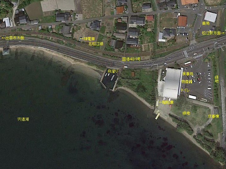 カヌー遊びやデイ・キャンプもできる宍道湖畔の道の駅。目の前の国道に沿って単線の北松江線が走っている。