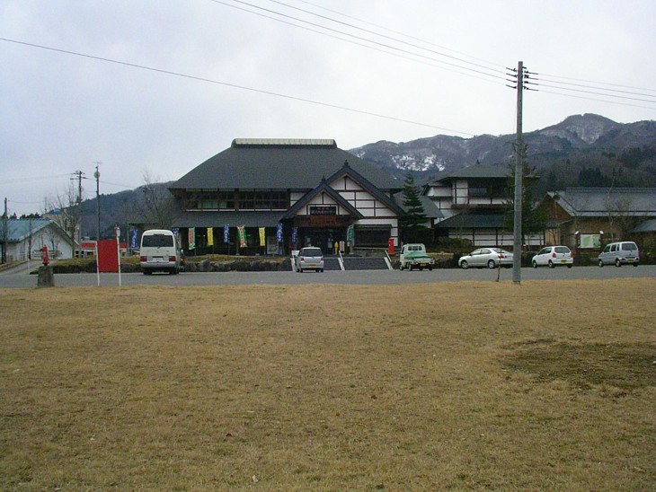 すぐ前の芝生から駅舎「清柳苑」を。広い駐車場に面して左にトイレ棟、右に展示施設と齋藤清美術館が並ぶ。
