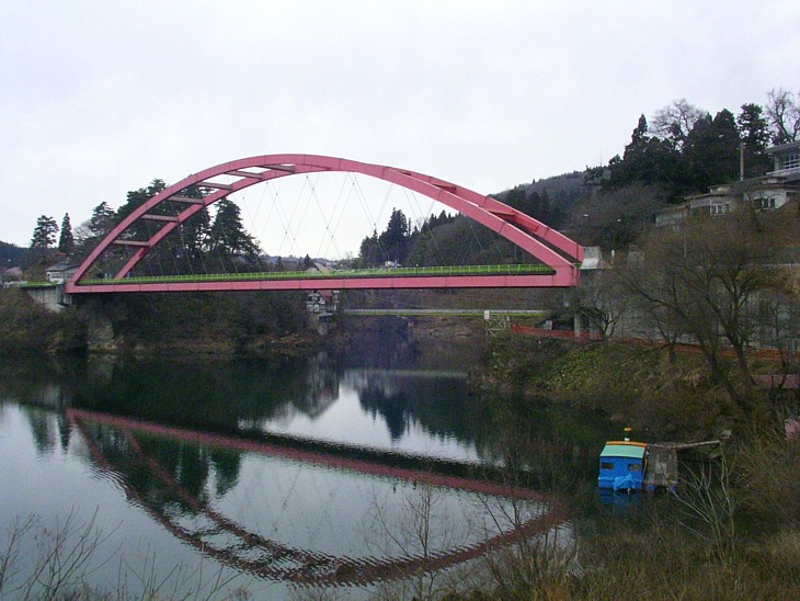 只見川は赤い橋の先で左にカーブしてから再び右に曲がり、約15km北で阿賀野川に合流して日本海へ。