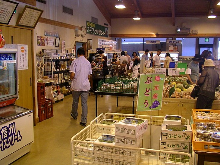 混雑する売場、レジは人の列。安曇野は野菜や果物の名産地で漬け物や農産物の加工品の種類も多い。