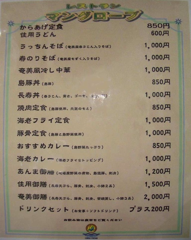 「レストラン・マングローブ」は10〜17時、57席、ごく普通の食事処。メニューは多彩で子供から大人まで選択できる(メニュー表)。 | ||||