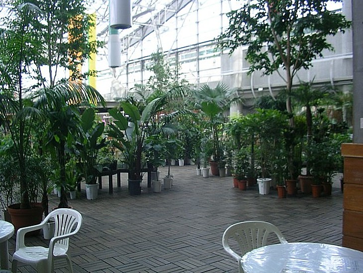 正面入り口側には喫茶コーナーがある。園芸ファンが花と緑に囲まれて至福のひとときを過ごせる趣向だ。
