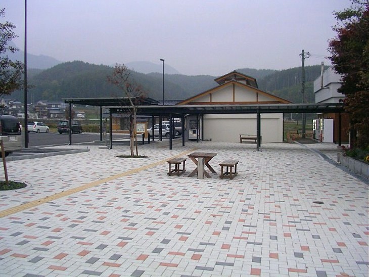 石畳にガーデンテーブルのあるアプローチ。背後の身障者用駐車場とトイレ棟の間には回廊、背後は食事処。