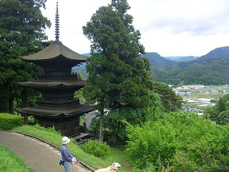 観音堂裏手の小道から三重塔を眺める。下から見上げるのが本来だが、この塔は背後からの姿が美しい。