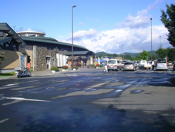 トイレ前から少し離れて、右手の正面入口と駐車スペースの方向を撮影。鳴子温泉郷に続く山並みが見える。