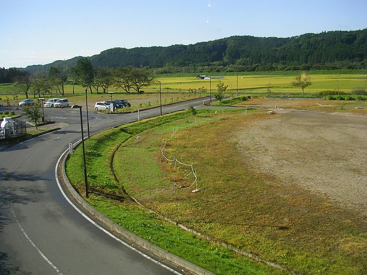 振り返って、西側には体育館とサブPと広いグラウンド、その先には散策向きの豊かな水田が広がっている。