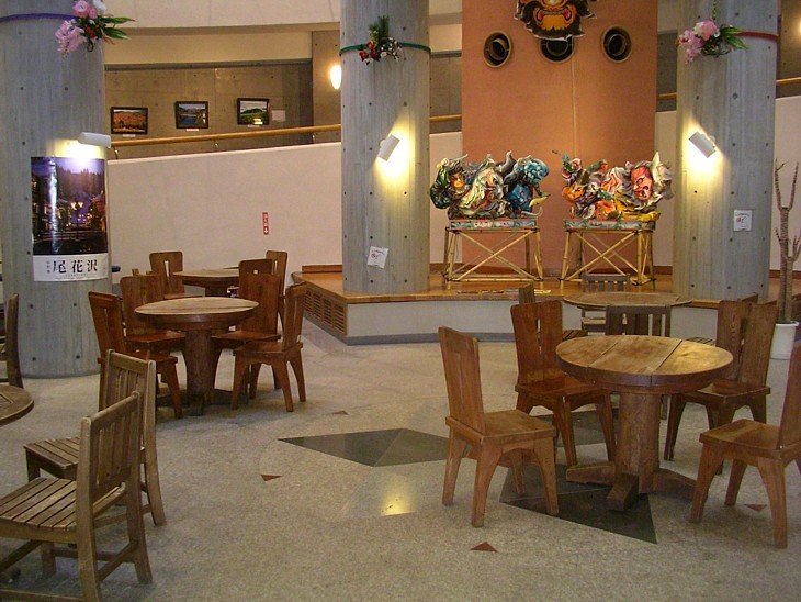 ロビーには不揃いのテーブルが数セット置いてあり、混雑している時間帯には絶好の休憩場所に利用できる。