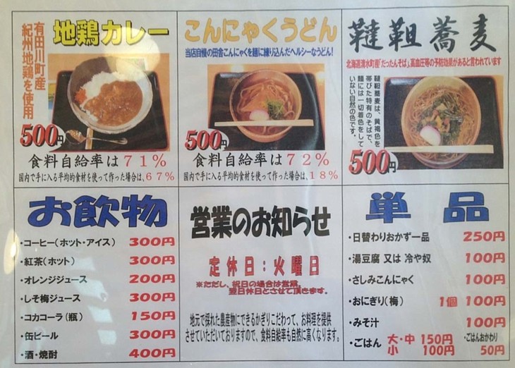ローカルだが落ち着いたアットホームな雰囲気。オリジナルメニューが主体で価格もリーズナブル、お薦めできる。韃靼そば・蒟蒻うどん各500円、定食類は650円〜750円、地鶏カレー500円・特選あらぎ定食650円・他のメニューはこちらで。 | |