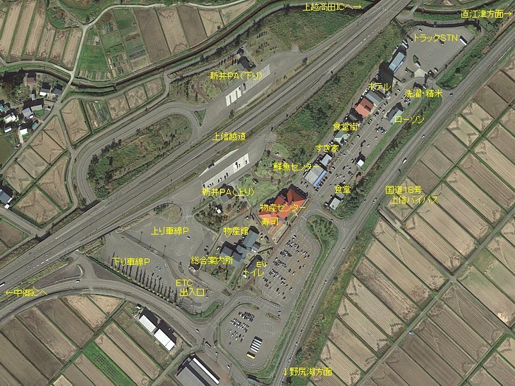 上信越道の小さなPAに便利なスマートICを併設、店も関連施設も多くて便利だがP泊にはやや騒がしい。