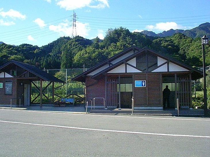 駅裏のトイレは男女別棟で、設備は古いが管理は行き届いている。裏の緑地公園で犬の散歩も可能だ。