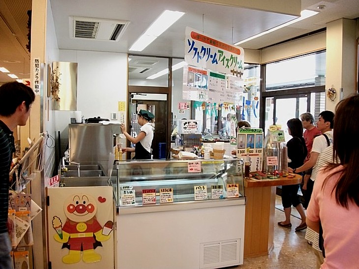 アイスのコーナーでは朝霧高原の新鮮牛乳を豊富に使ったソフト&アイスを扱う。種類が多くて人気も高い。