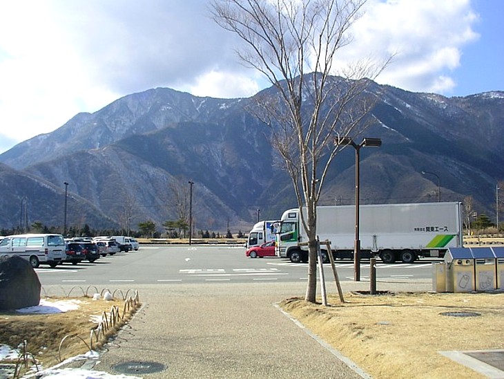 左のトイレ横から駐車場を。大型車用は分離されスペースも広いが、全体の面積の割に普通車用はやや手狭だ。