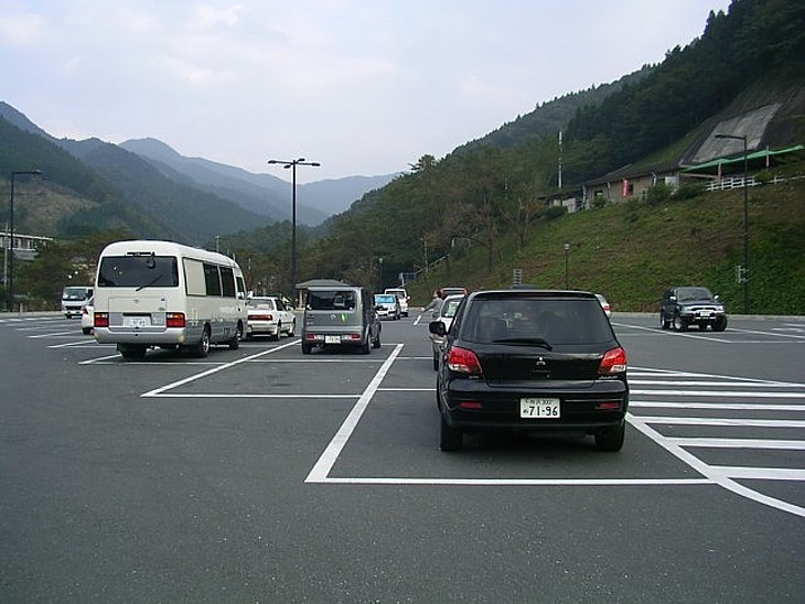 駅舎を背に正丸峠の方向を。駐車場はやや変形だが狭くない。大型車の区分が不明確なので混在している