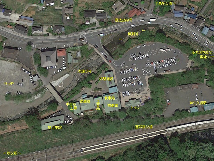 果樹公園村は横瀬川対岸を北へ10分ほど。駅舎裏手の第二駐車場は休日のみ利用できる可能性あり。