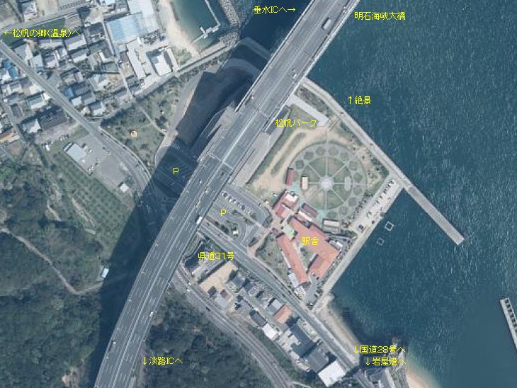世界最長の吊り橋「明石海峡大橋」の直下、展望が素晴らしい。昔はこの近くにフェリー埠頭があった。