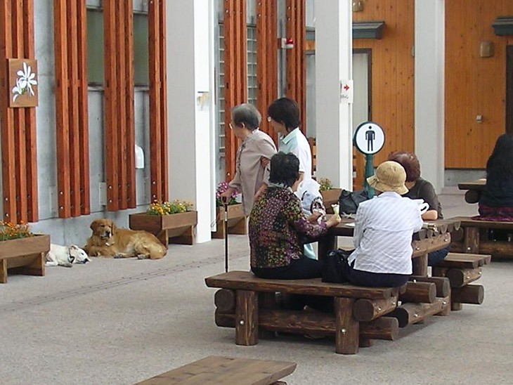 たまたま老人の団体さんと一緒になり、一人の女性が興味深そうに我が家の犬どもと目を合わせていた。