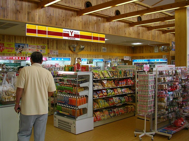売店の大部分を占めるヤマザキショップ。隣接して狭い物産コーナーもあるが、品揃えが貧弱で魅力に欠ける。