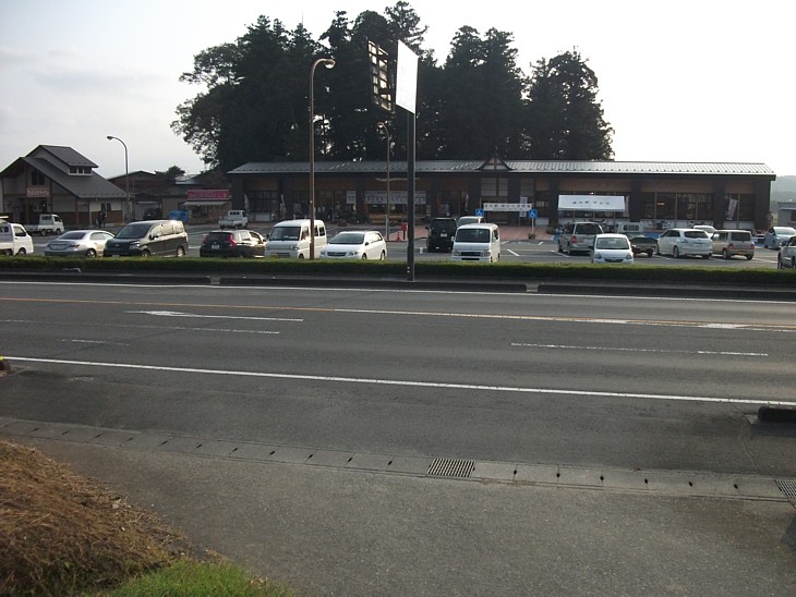 左から別棟のトイレ棟、物産館と食事処のあるメイン駅舎、裏道に下る通路を隔てて町の観光センターがある。