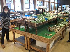 左: 店頭の野菜直売コーナーは毎朝8時にスタートする。野菜の価格は特に安いと言う程ではないが種類は豊富で、新鮮なのは間違いない。