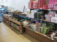 左&中: 物産館では既製品の土産物に加えて手作りの惣菜や菓子など郷土色の豊かな産品も扱っている。特産品の猪肉「八溝ししまる」や
