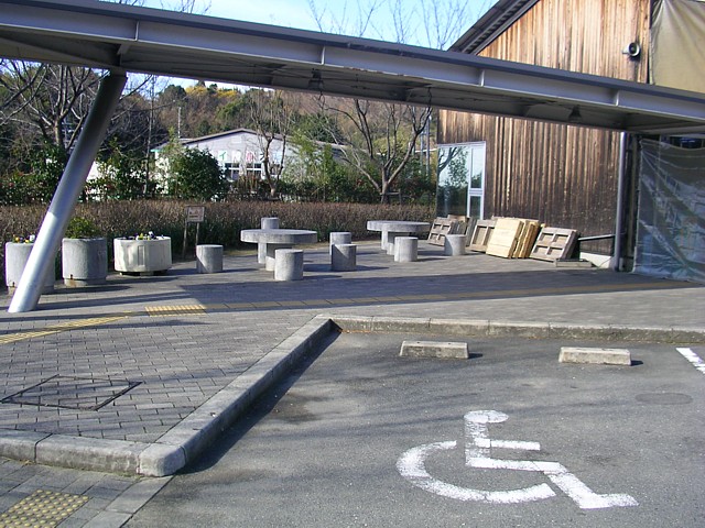 駐車場の左奥には屋外の休憩施設。飛鳥川の対岸が福祉施設、その奥に資料館と孝徳天皇陵が続く。