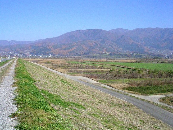 土手の下には千曲川の河川敷が広がる。右前方の山裾を過ぎると右側がスキーと温泉の聖地・野沢温泉。