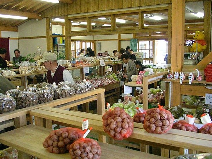 地元の産物が豊富な産直野菜のコーナー。今回は胡桃と茸類が豊富だった。初夏には山菜がメインになる。