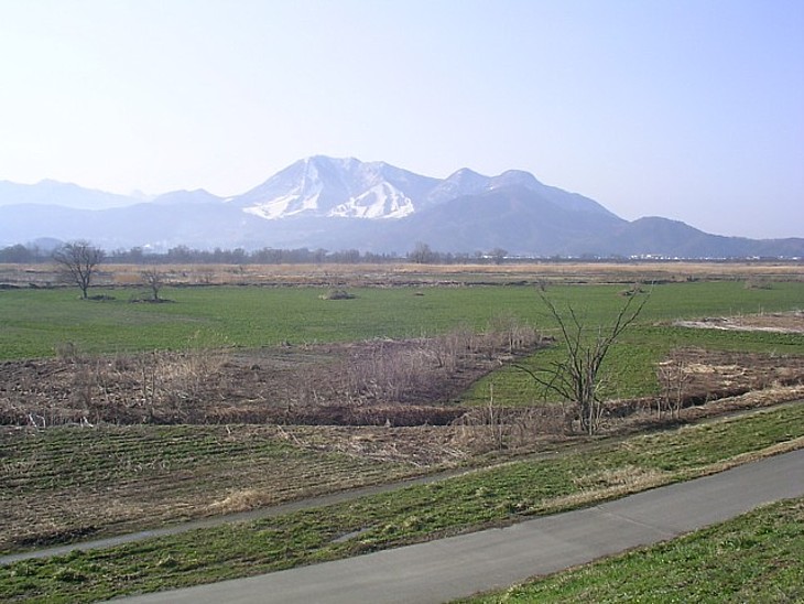 千曲川河川敷の一部は緑地に整備されている。国道のまっすぐ南、高社山北麓には木島平スキー場の遠景。