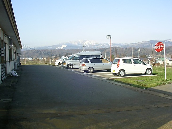 駅裏の従業員用駐車場はP泊のお薦めスポット。風を防げるし車の音も気にならない。背景は雪の斑尾高原。