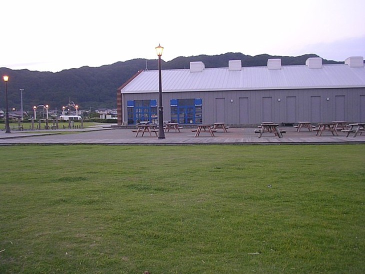 海側の芝生から中庭と物産館を撮影。キャンピングカーの屋根が少し見える一帯がメイン駐車場。