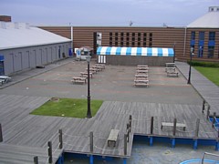 物販内のカフェテリア(ブログ)は8時〜17時、ウッドデッキも利用できる。休日には建物周辺に屋台が出ることもある。 |