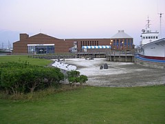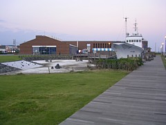 駅舎横のふれあい広場ではノーリードで走らせるのも可能。海沿いに続くウッドデッキの遊歩道など、散歩向きルート多数。 |
