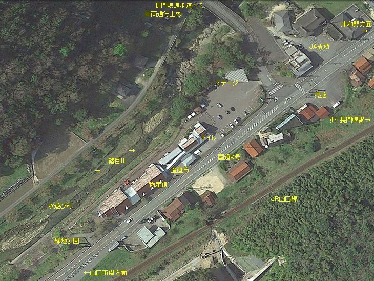 秋の紅葉が見事な名所・長門峡遊歩道の入口にある小さな道の駅。片道約5kmの渓谷美が続いている。