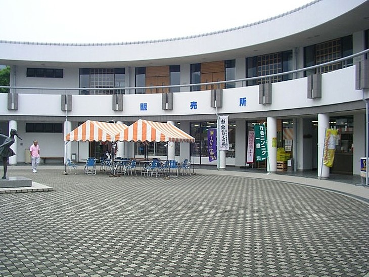 中庭を囲む駅舎には工房や土産物店が並ぶ。左から物販・喫茶・事務室・陶芸・ガラス工房、など。