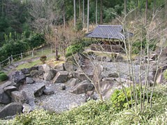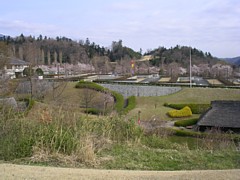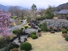 中:窪地のせせらぎに沿ってユキヤナギが植えられ、築後300年の古民家が移設されていた。