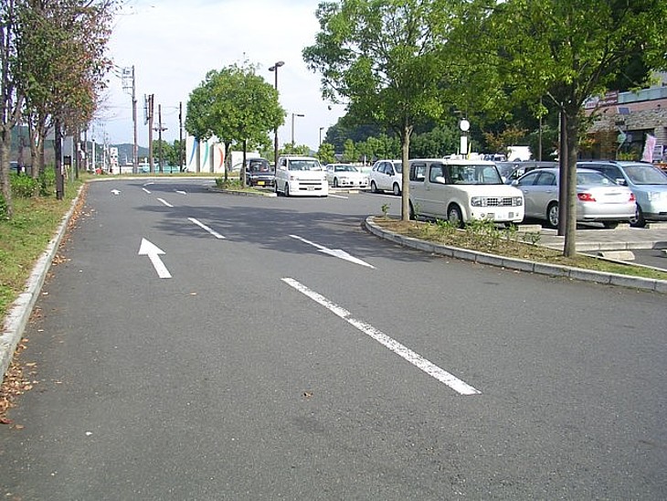 駐車場両端に出入り口があるため国道沿いに車路があり、使いやすいが駐車場を圧迫している。