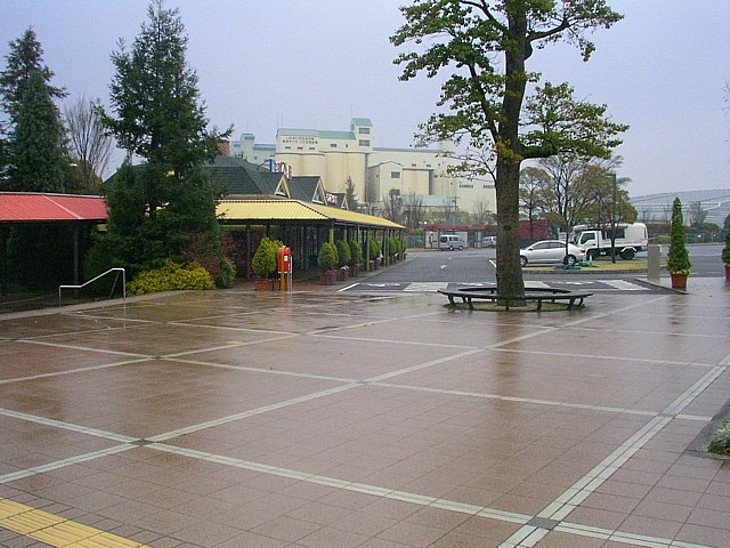 黄色の屋根が野菜売場、背景にはデンパークに隣接するJA総合センターの広大な施設が並んでいる。