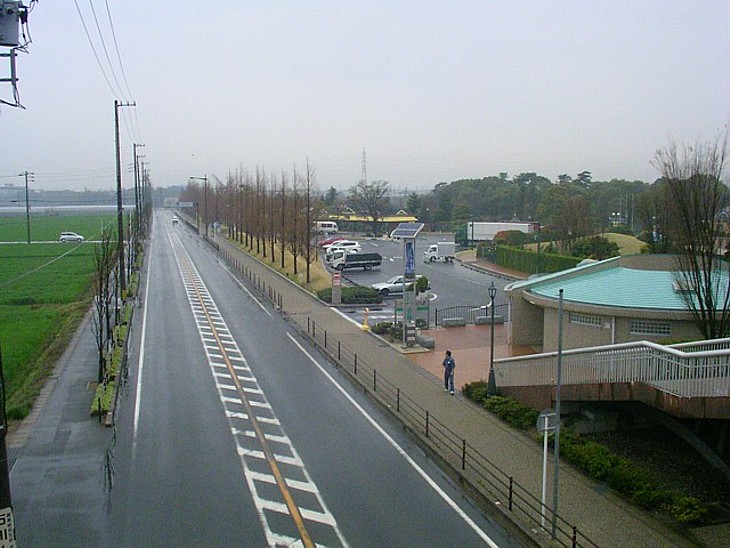 陸橋の上から駅の敷地全体を。真っ直ぐ伸びる道路と銀杏並木の周辺の豊かな緑、環境は素晴らしい。
