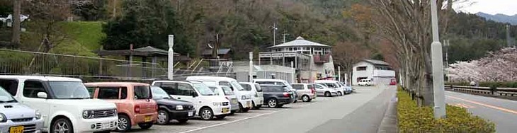 公称は大型車5台+普通車28台、隣接する廃業ホテル前にも10台ほど、ダム公園にも20台程度は駐車できる。 |