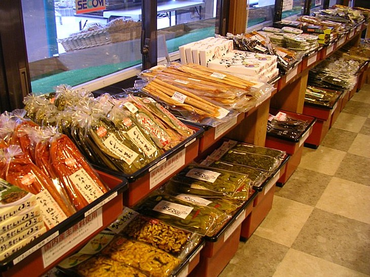 にんにく味噌・山ごぼう・野沢菜・漬け物類など、派手さのない地元の加工品が売られている。