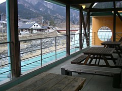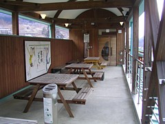 食事処横の小さなスペースは営業中のみ利用可。冬以外なら屋外に数ヶ所と2階のベランダにテーブルやベンチがある。 | |