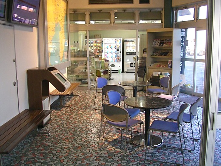食堂側から見た休憩&案内施設。スペースは十分広く、椅子やテーブルも機能的に配置されている。