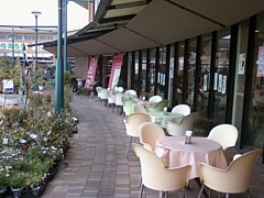 上: 「花の交流館」のカフェ・ラスパイユは10〜19時、喫茶を兼ねたレストラン。花に囲まれて時を過ごすのも悪くない。価格もまぁまぁ。